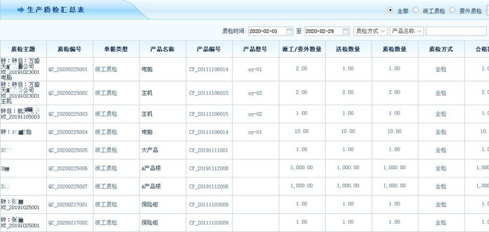 一、在系统生产质检环节,可细化到工序级别,支持工序质检、派工质检、工序委外质检、整单委外质检等,可根据管理需求单个添加质检单,也可批量添加,助力企业灵捷质检。业务人员还可以根据线上不合格分析数据,不断调整加工方法,提升产品质量,降低生产成本,增加产品竞争力与订单达成率。当质检合格后,可自行入库,对质检不合格的产品,则进行返工或者报废入库,实现企业资源共享和业务流程整合,达成精益运营。