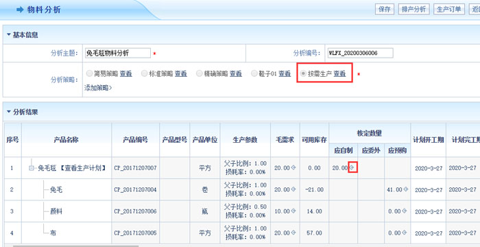 一、在系统中,企业可以根据不同物料分析策略进行物料分析,并为企业提供了简易、标准、精确等策略,供企业一键选择,企业也可根据实际生产需求,自定义添加分析策略,助力企业对需要生产的产品数量、开工日期、完工日期等进行一键规划,使计划更加科学可行,实现敏捷制造。同时,系统支持企业从物料分析结果快速生成生产订单、排产分析、预购等单据,各环节紧密衔接,自动流转,当所需物料不足亦或是因品质原因需要替换时,企业也可以设置物料替代,确保生产及时供给,达成高效生产。