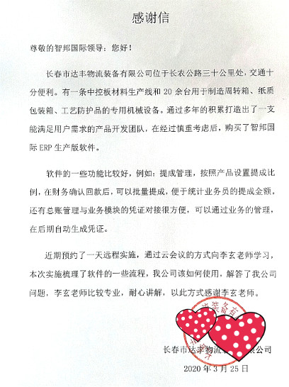 长春市达丰物流装备有限公司向智邦国际送感谢信