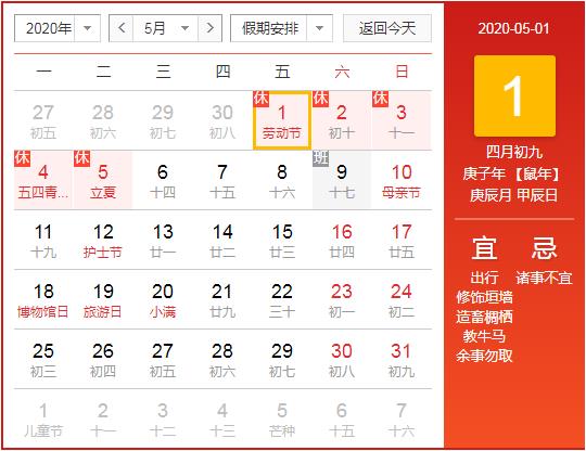 5月1日(星期五,劳动节)至5月5日(星期二)放假调休,共5天。4月26日(星期日)、5月9日(星期六)照常上班。放假期间若给您带来不便,敬请谅解!