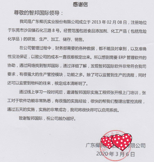 广东椰氏实业股份有限公司智邦国际ERP系统感谢信