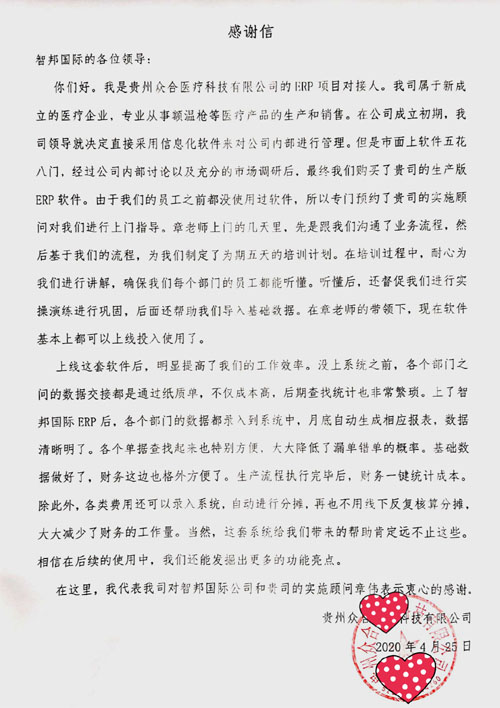 贵州众合医疗科技有限公司向智邦国际送感谢信