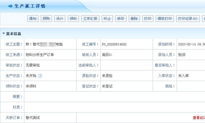 智邦国际ERP系统科学生产派工详情部分界面