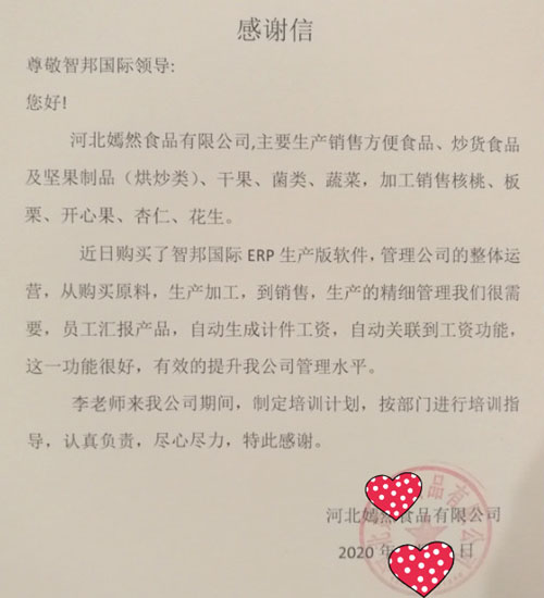 河北嫣然食品有限公司向智邦国际送感谢信