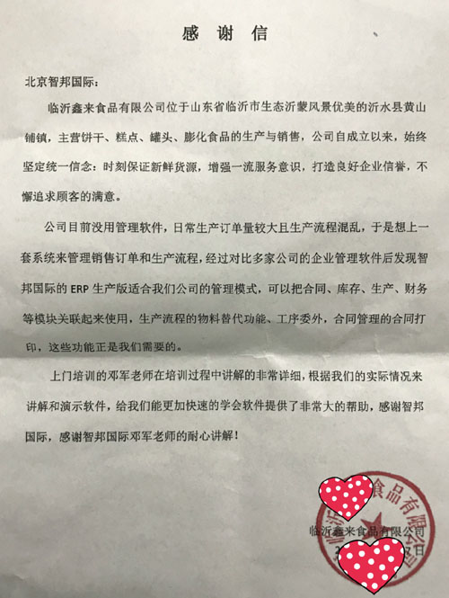 临沂鑫来食品有限公司向智邦国际送感谢信