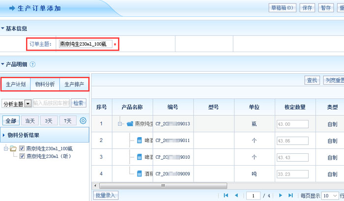 一、为了满足企业不同的生产需求,为企业提供了手动录入,由生产计划、物料分析结果、排产分析结果一键生成生产订单,企业可根据客户订单的需求量和交货期来进行生产安排。其中,当生产计划处于简易生产时,可以由生产计划单直接生成生产订单;当生产计划处于计划型生产时,则可以由物料分析单直接生成生产订单;当生产计划处于订单型生产时,还可以由排产分析单直接生成生产订单,并为企业提供了暂存订单功能,方便业务人员随时编辑生产订单,灵活应对多样化生产需求,避免出现丢单漏单和订单延期交付等现象,有效提升产能,让生产变得更加轻松。