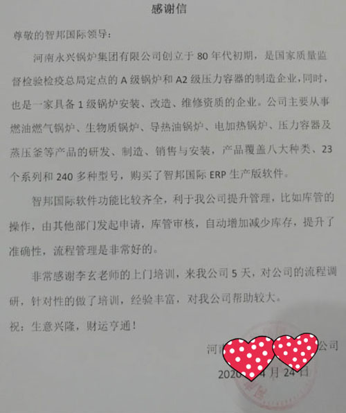 河南永兴锅炉集团有限公司智邦国际ERP系统感谢信