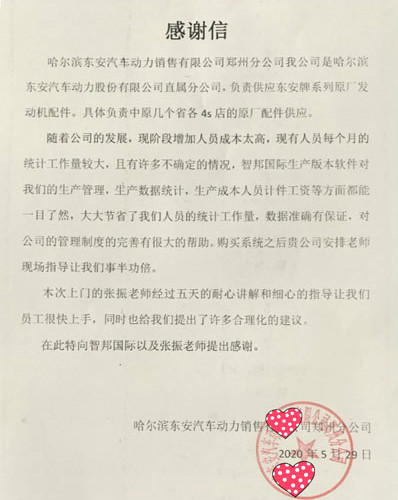 哈尔滨东安汽车动力销售有限公司郑州分公司正式签约智邦国际ERP系统,希望通过系统的应用,可以构建信息实时共享管理平台,优化企业内部管理架构,使得企业业务处理能力更加敏捷化和智能化,助力企业在激烈的市场竞争中占有一席之位。