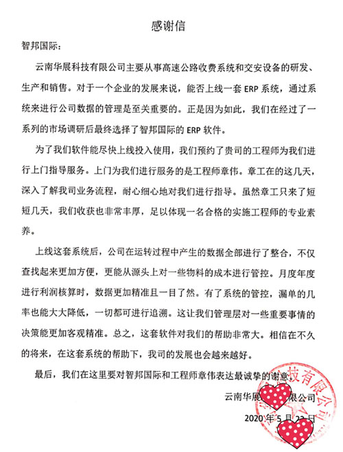 云南华展科技有限公司向智邦国际送感谢信