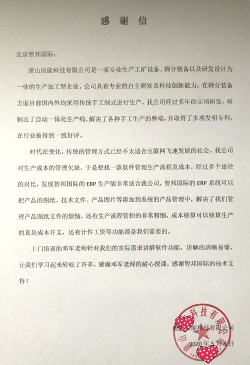 唐山应能科技有限公司向智邦国际送感谢信