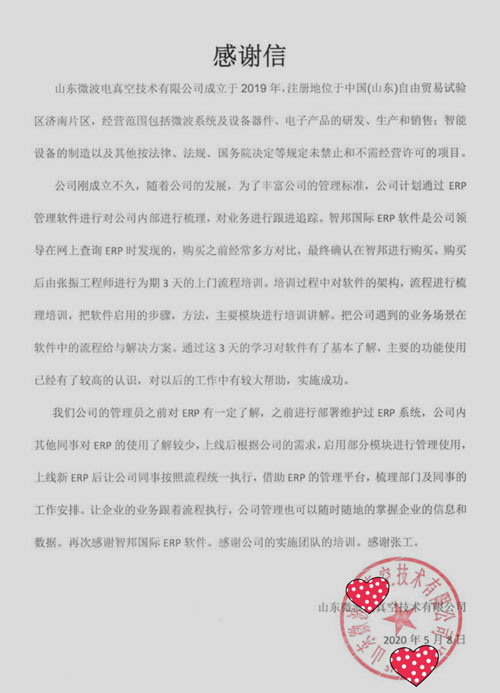 山东微波电真空技术有限公司向智邦国际送感谢信