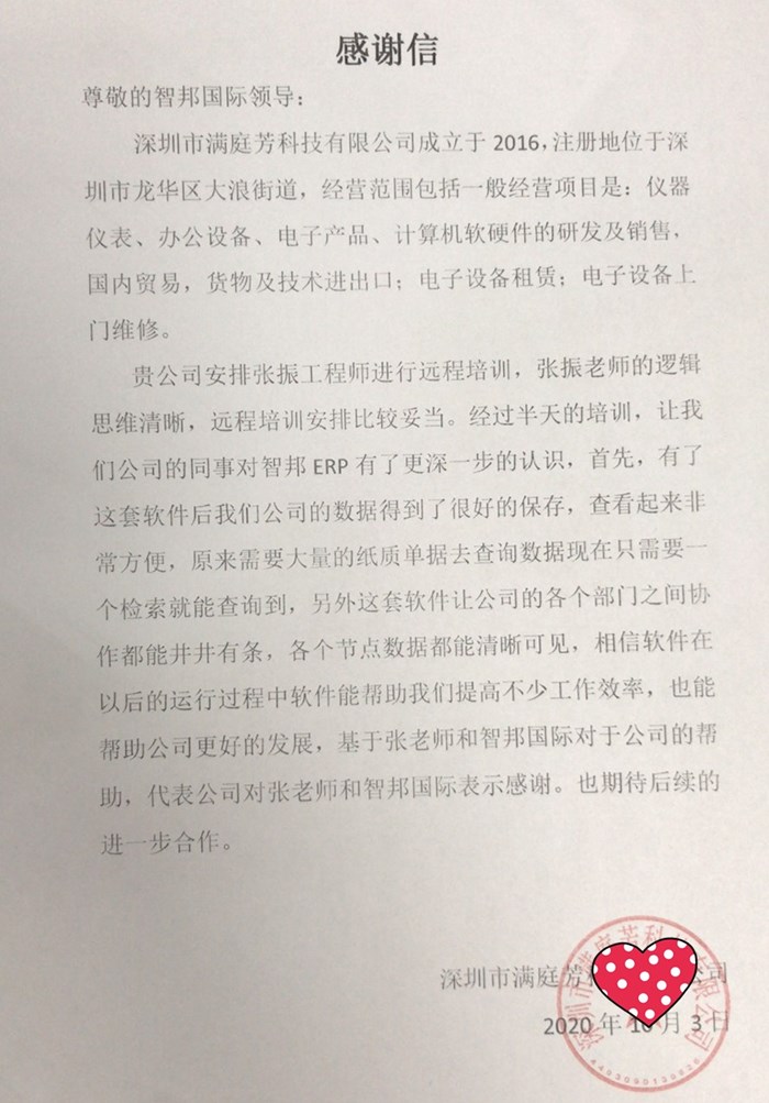 深圳市满庭芳科技有限公司向智邦国际送感谢信