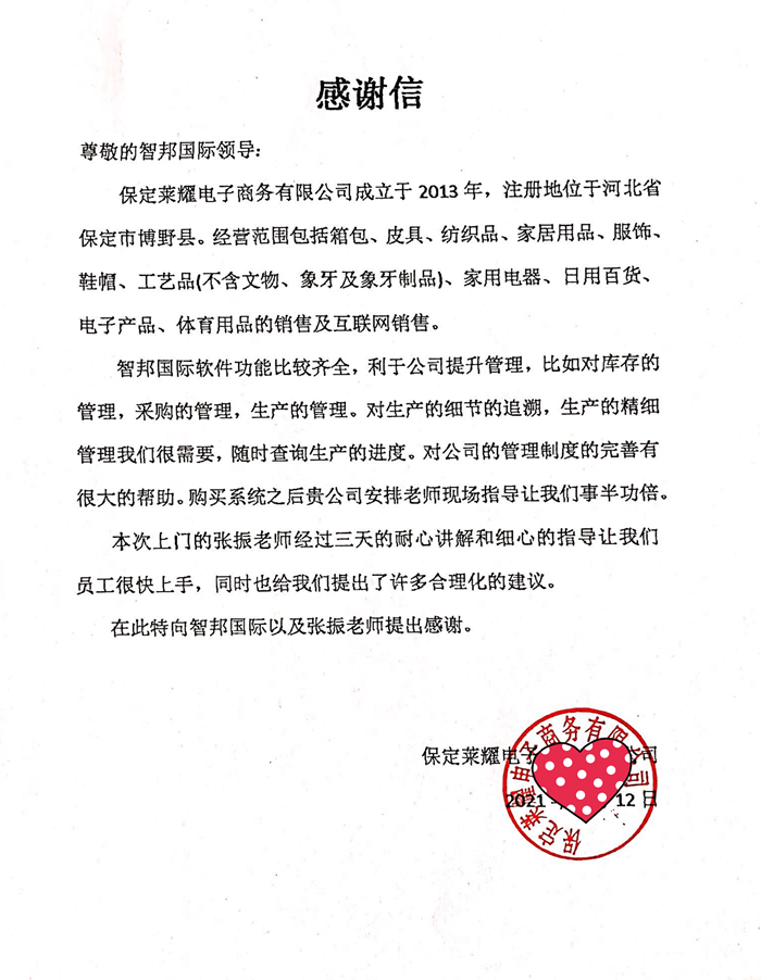 保定莱耀电子商务有限公司向智邦国际送感谢信