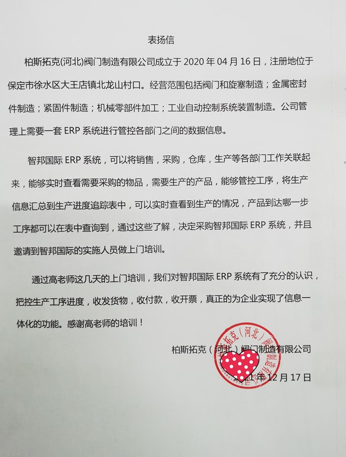 柏斯拓克(河北)阀门制造有限公司向智邦国际送感谢信