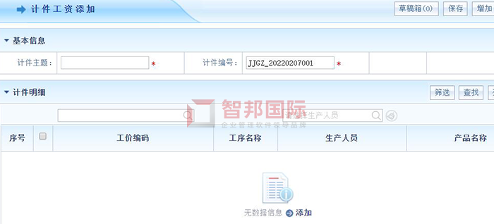 智邦国际ERP系统生产板块中对生产工资的管理,支持对计件工资、计时工资、奖罚管理等方面进行核算。在计件工资添加界面中,计件明细中可一键跳转到工价选择界面,信息自动同步,互联互通。对于生产人员的添加,系统也支持自定义选择,在一个界面中,工序名称、生产人员、产品名称、产品编号、计件日期、生产数量等信息,都可在一个界面中展现,方便管理层随时查询和追溯。