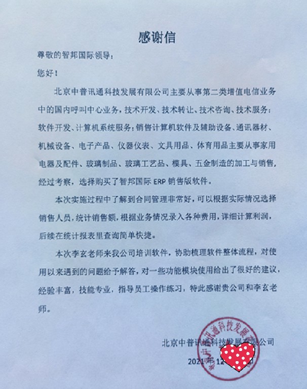 北京中普讯通科技发展有限公司向智邦国际送感谢信