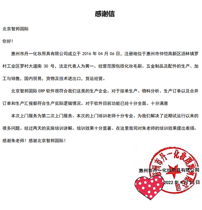 如今,企业想要在市场竞争中掌握主动权,需全面升级数智化管理水平。相信通过引进智邦国际ERP系统,丹一化妆用具能够实现企业管理的数智化转型,实现提质、增效、降本。