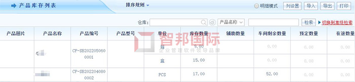 智邦国际ERP系统产品库存列表(局部图)