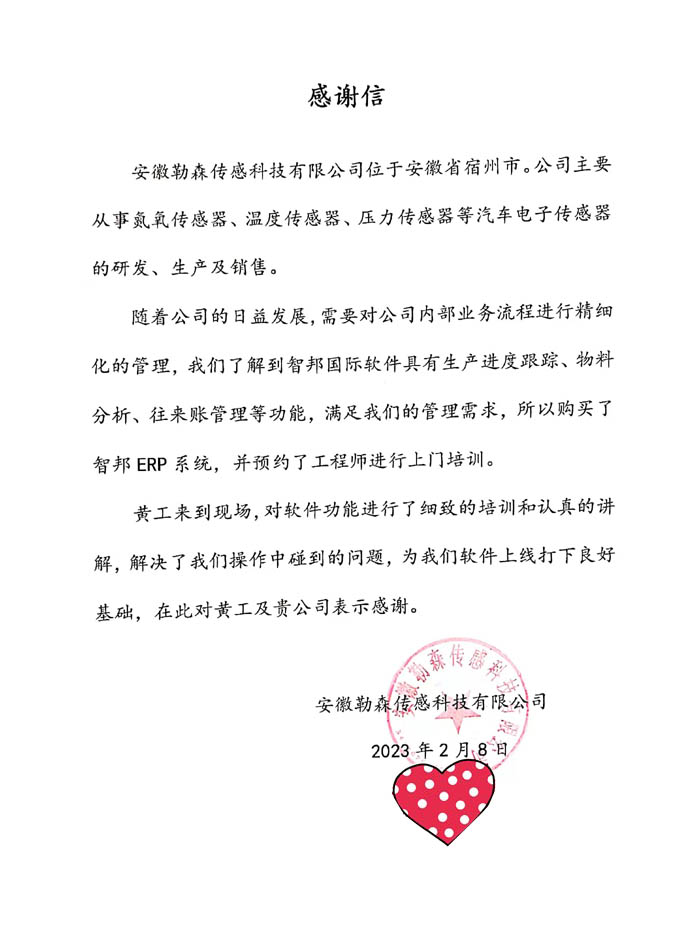 企业要想在激烈的市场竞争中占据主动地位,就需要加快自身数字化建设部署。相信通过引进智邦国际ERP系统,勒森传感科技能够有效解决企业各环节管理难的问题,打造信息化、一体化管理平台。