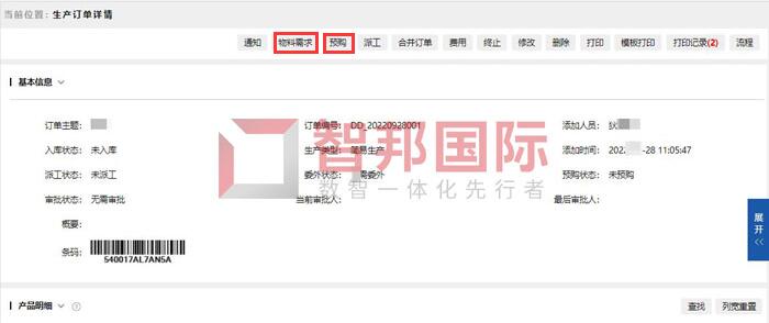 智邦国际ERP系统生产订单详情(局部图)