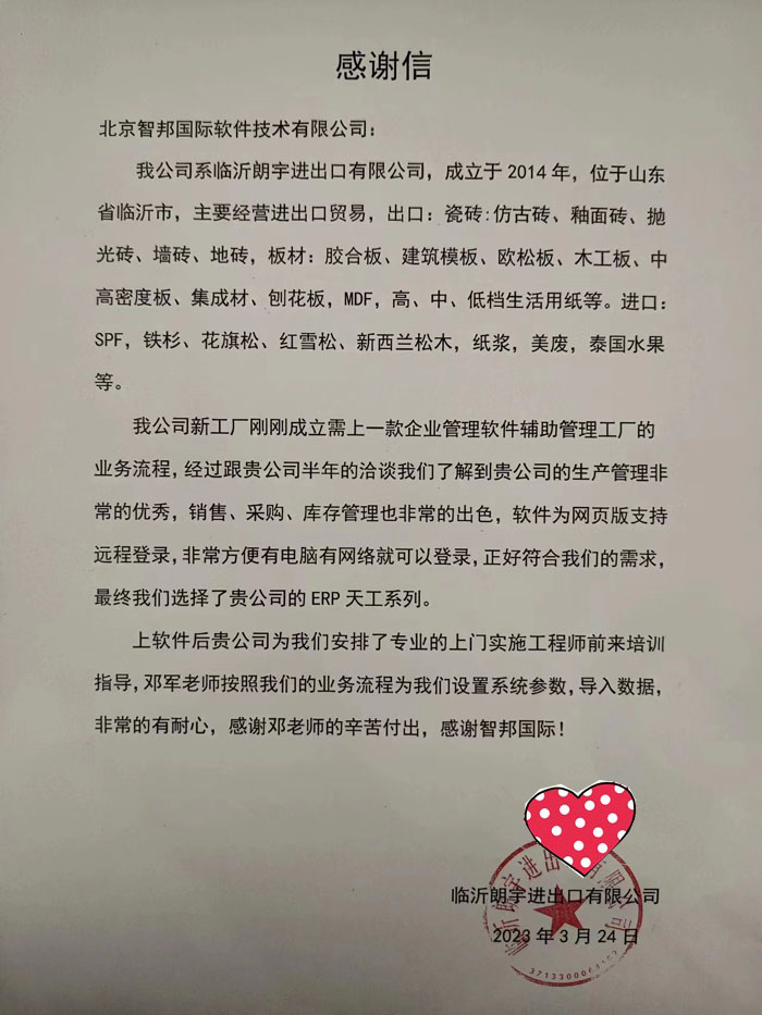 近日,临沂朗宇进出口有限公司签约智邦国际,希望通过智邦国际ERP系统的使用,搭建线上生产数据库,业务数据实时同步、全面共享,一键解锁精益排产,不断提高生产效率和效益。