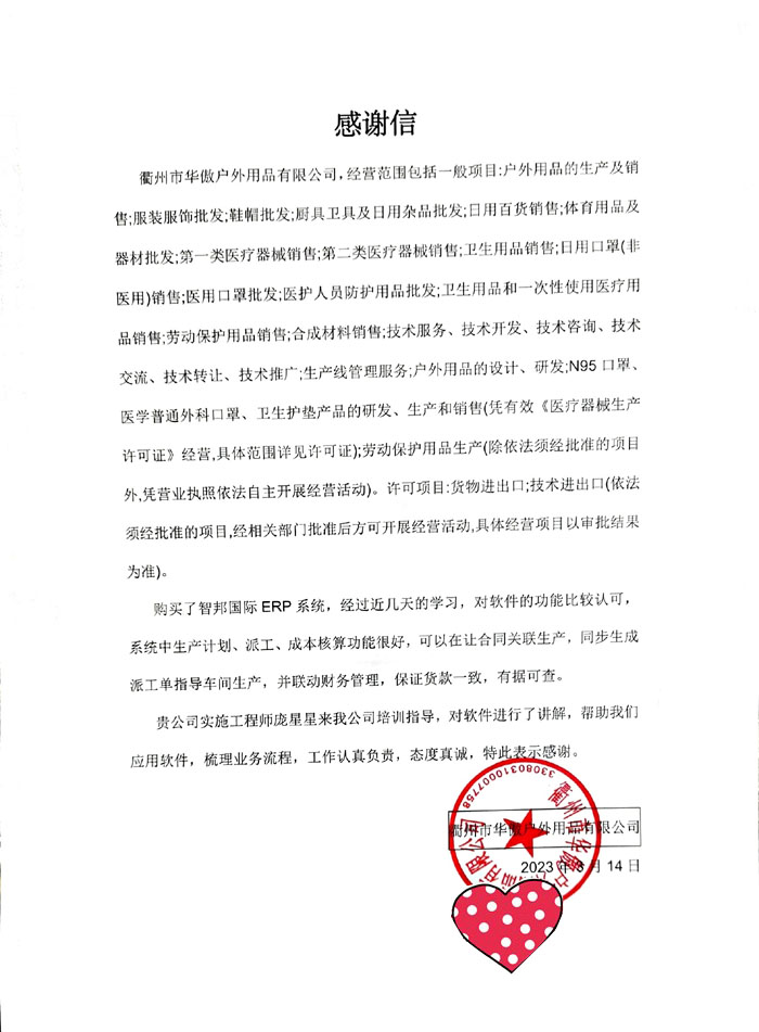 华傲户外用品向智邦国际送感谢信