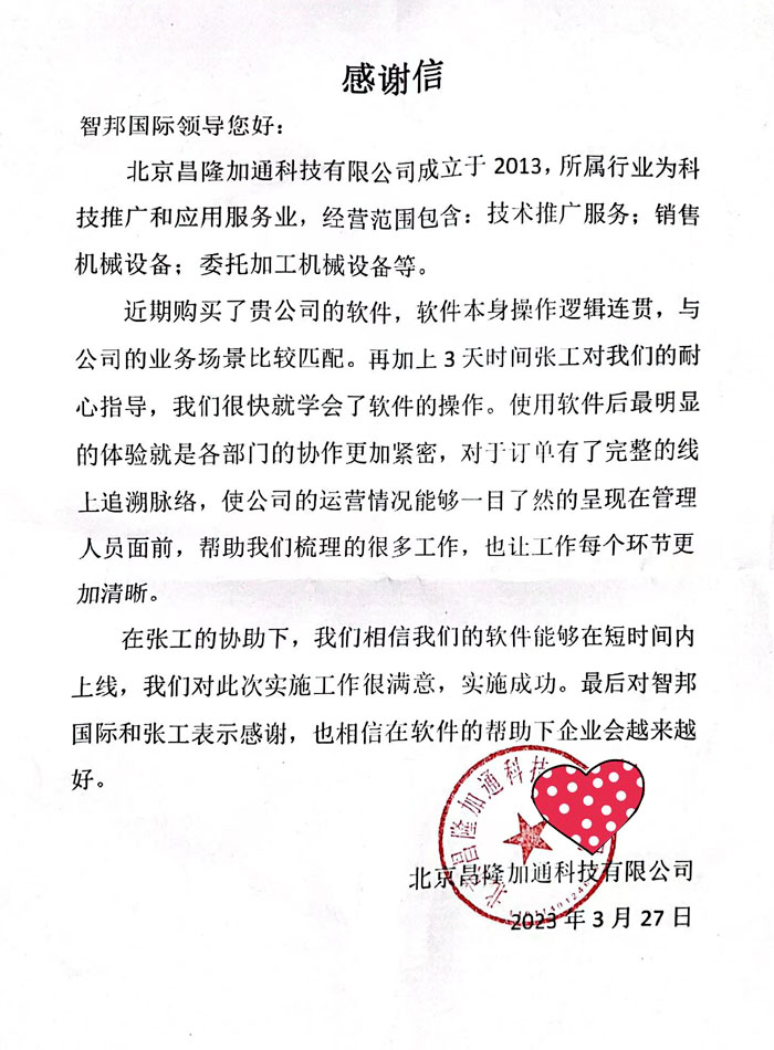 昌隆加通科技向智邦国际送感谢信