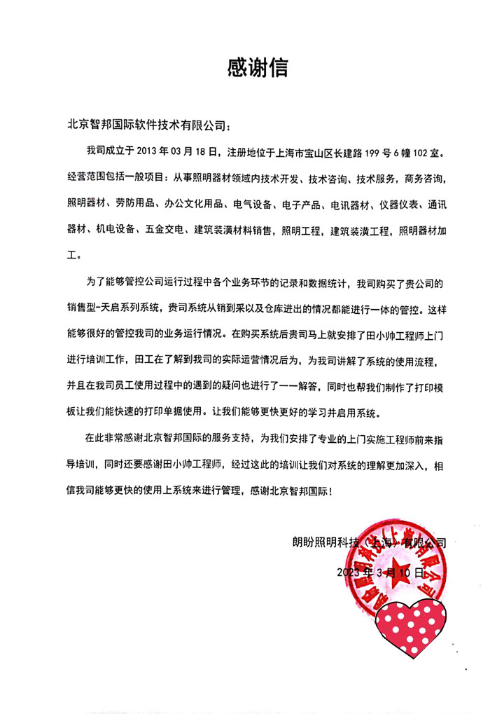 近日,朗盼照明科技(上海)有限公司签约智邦国际,希望通过智邦国际ERP系统的使用,能够在一个平台上开启一站式管理,打造数字化管理闭环,实现一体化运维,提高协作、办公效率。