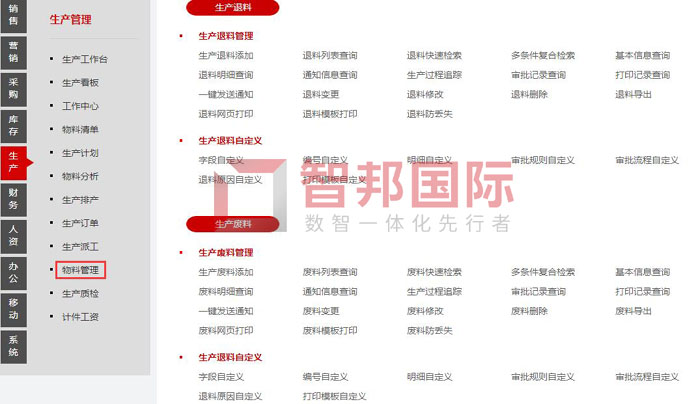 智邦国际ERP系统物料管理功能表(局部图)
