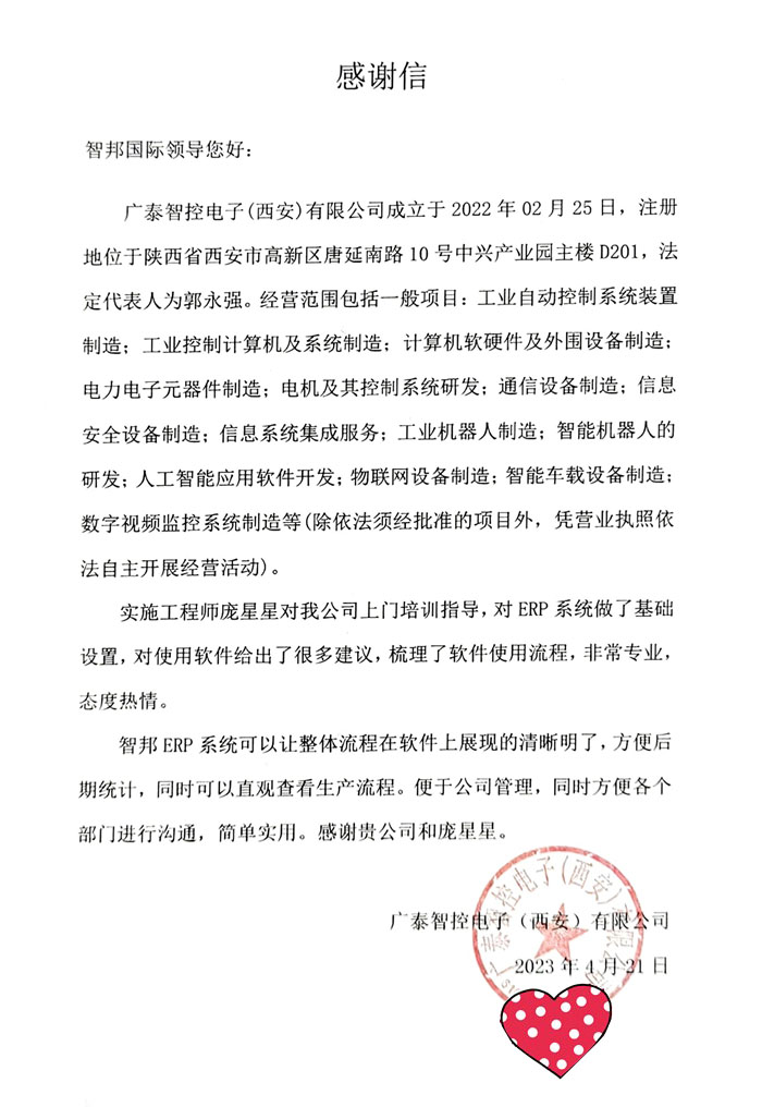 近日,广泰智控电子(西安)有限公司签约智邦国际,希望通过智邦国际ERP系统的使用,在一个平台上集中管理企业业务,确保业务数据准确、迅速、有效传递,提高订单交付率。