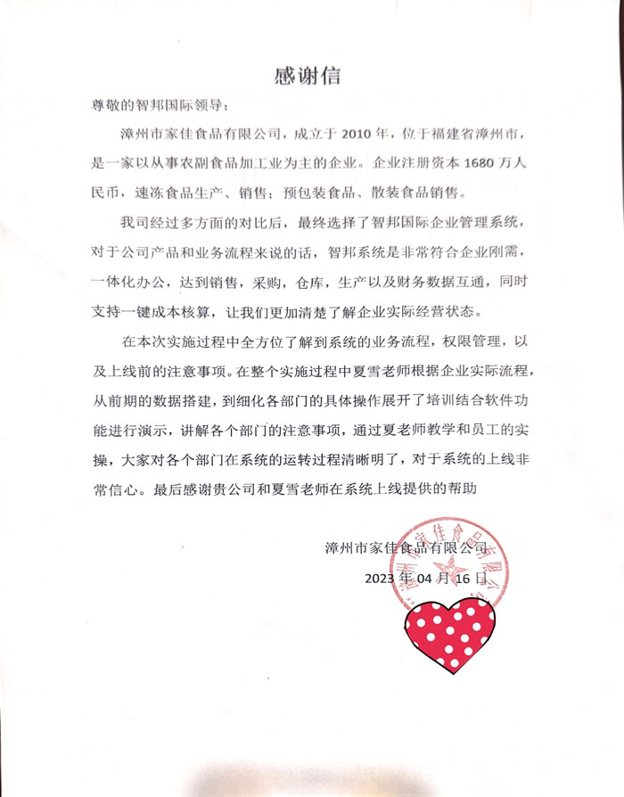 家佳食品向智邦国际送感谢信
