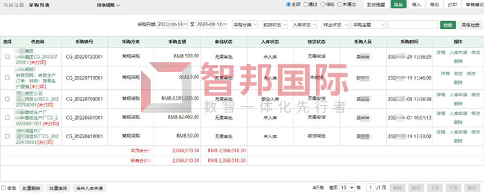 智邦国际ERP系统采购列表(局部图)