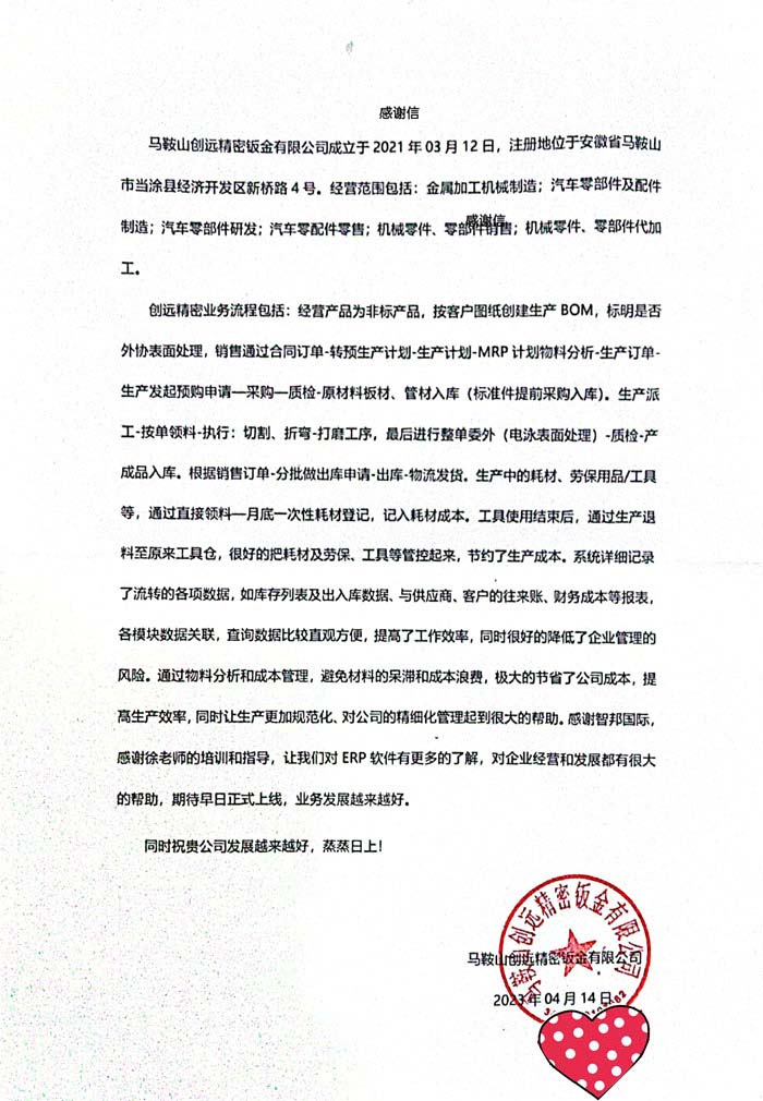 近日,马鞍山创远精密钣金有限公司签约智邦国际,希望通过智邦国际ERP系统的使用,打造一体化管理平台,数据只需录入一次,即可全面应用,生产成本自动核算,助力企业智能降本增效。