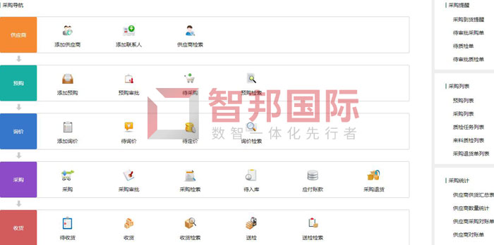 智邦国际ERP系统为企业提供了一站式采购导航,包含供应商、预购、询价、采购、收货、来料送检等功能模块,线上数据实时添加,单据自由流转,打破企业内外部管理壁垒,便于企业从源头把控采购质量,提高资金安全防范意识,规避潜在经营风险。另外,系统设有线上采购提醒功能,有效防止信息遗漏。