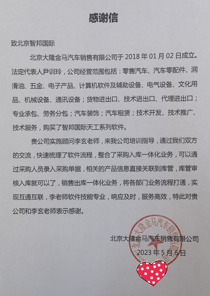 大隆金马汽车销售向智邦国际送感谢信