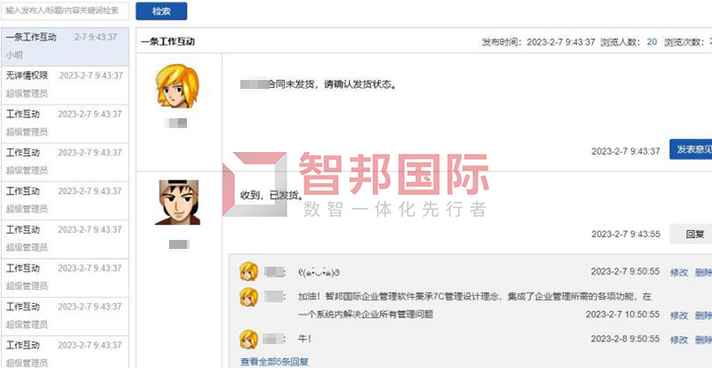 功能价值:智邦国际32.09版本,新增关联式全新工作互动,在原有工作互动功能基础上,支持从业务单据详情,一键添加工作互动,随时随地发起互动,将工作互动与业务单据互相关联,业务执行中,沟通内容、过程、记录、人员等有迹可循,全面提升沟通通信的及时性、一致性,更让高效顺畅沟通伴随工作、业务全程每一步;同时,采用主流聊天图像、窗口等模式,全面提升互动交流的效率、质量和体验。