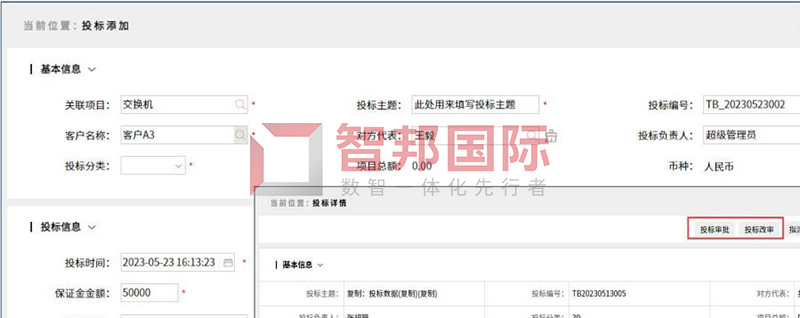 功能价值:智邦国际32.09版本,新增一站式投标全程管理,一次配齐“投标”添加、申请、审批、分类、详情、列表、检索、导出、统计、保证金以及关联客户、项目、单据等全面功能,投标全程闭环管理;同时提供“标书”批量上传、查看、下载、多级审批、追溯查询等;关键可以根据所选投标结果,自动匹配对应业务流程;还有投标保证金明细表,详细记录每笔保证金从缴纳到退还每一步……赶快试试吧!
