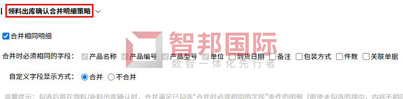 功能价值:智邦国际32.09版本,新增合并式领料/补料出库,相同物料出库确认时,自动合并呈现,方便库管快速核对出库数量和现有库存;出库完毕后,自动按照既定流程按单配货,方便领料员按单核对物料种类和应领数量等;并可自定义设置出库合并明细策略,比如,哪些字段相同时才可合并,或是否需要合并,以及合并后,原有自定义字段如何显示……灵活满足电子、零配件等行业多单据、多种类相同物料快速出库、领料等需求。