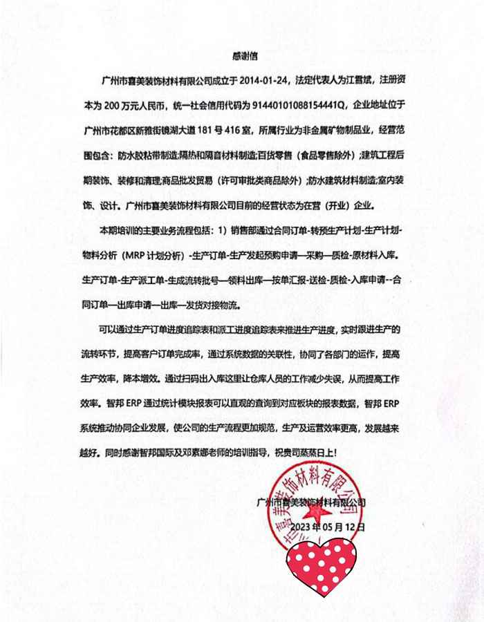 近日,广州市喜美装饰材料有限公司签约智邦国际,希望通过智邦国际ERP系统的使用,销售订单一键轻松流转至生产部,各环节智能衔接,降低企业运营成本。