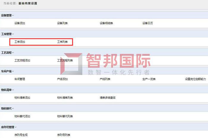 智邦国际ERP系统助力企业实现集约化生产资源管理。系统一站式基础档案设置功能,贯穿设备、工序、工艺流程、车间产线、物料清单、物料替代、序列号等管理模块,数据一键添加,单据自由流转,打破各环节、各部门、各岗位信息壁垒,提高资源利用率。在工序管理模块,可实时添加工序数据,一键查看全部工序信息。