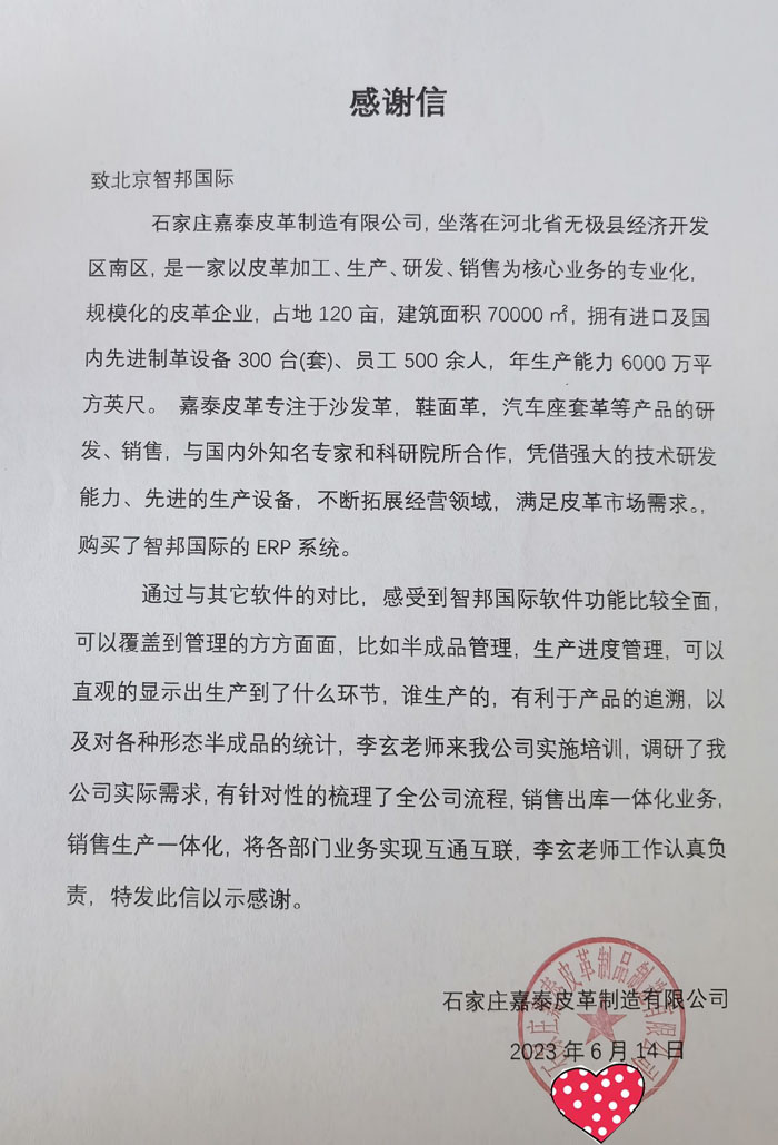 近日,石家庄嘉泰皮革制品制造有限公司签约智邦国际,希望通过智邦国际ERP系统的使用,疏通企业管理脉络,消灭信息孤岛,开启智慧生产之旅。