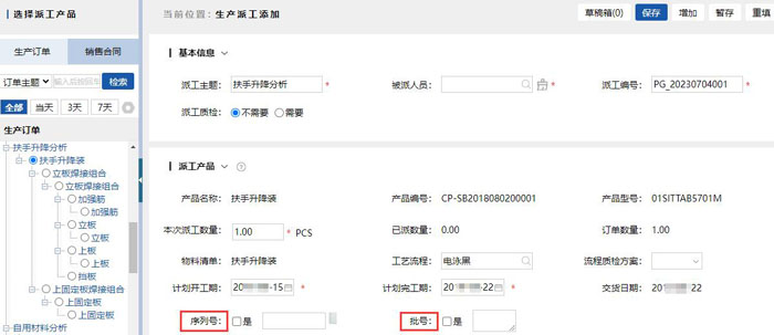 在智邦国际ERP系统中,可通过生产订单和销售合同等单据进行生产派工添加,一键调取被派人员,可对派工进行质检管理,派工产品、所需物料、执行工序等数据自动展现,促成全流程一体化协同,打破销售、生产等环节信息壁垒,订单流转无缝衔接。另外,在系统中,可对派工产品进行序列号和批号管理,如果后续出现任何问题,都可及时溯源。