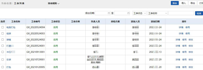 在智邦国际ERP系统工序管理模块,可在线工序添加,各层级人员可在工序列表一个界面,了解全部工序信息,比如,工序名称、编号、状态、分类、负责人、质检方案、添加人员、添加日期等数据,可一键查看工序详情、修改工序信息,也可一键停用工序,操作灵活,省时省力。