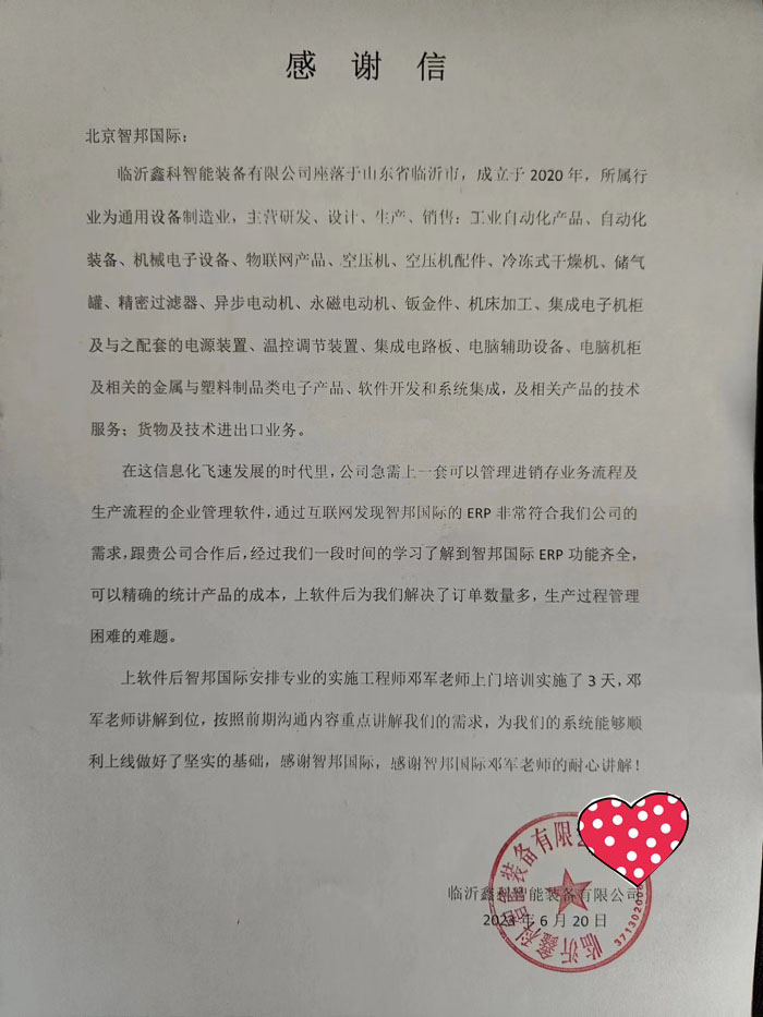 鑫科智能装备向智邦国际送感谢信
