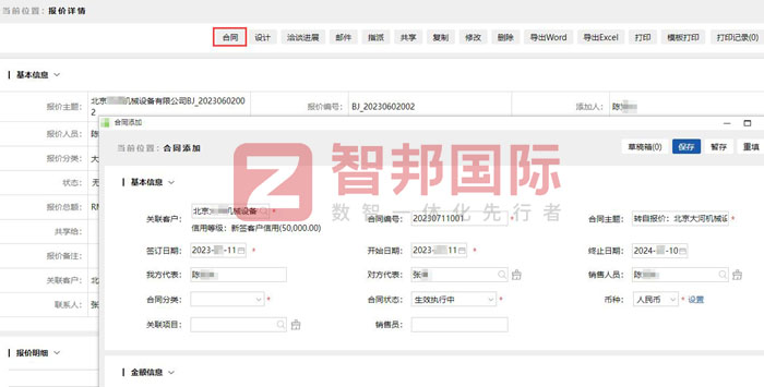 智邦国际ERP系统支持在线报价添加,报价基本信息和报价明细等数据,一览无余,可一键共享报价信息,大大提升信息流转效率。报价可一键生成合同,自动关联相关客户,合同总额、优惠后总额等数据自动生成,可自定义设置收款计划、开票计划、开票类型等,合同可同步生成预生产计划,打通销售、生产、财务等环节协作沟通壁垒。