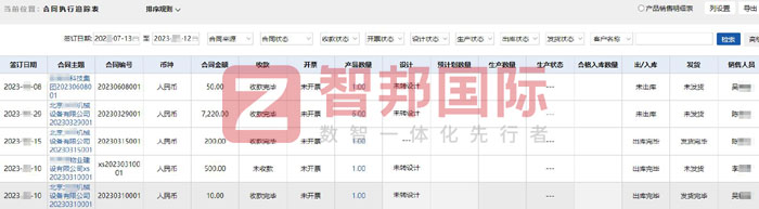 智邦国际ERP系统充分打通底层数据,为企业建立一站式管理平台。为方便各层级人员实时了解合同执行进度,系统设有智能化合同执行追踪表,合同金额、收款、开票、产品数量、设计、预计划数量、生产数量、生产状态、出/入库、发货、销售人员等数据,一目了然,充分保障数据在流转过程中的准确性、时效性、及时性,便于企业及时发现、解决合同执行过程中出现的问题。