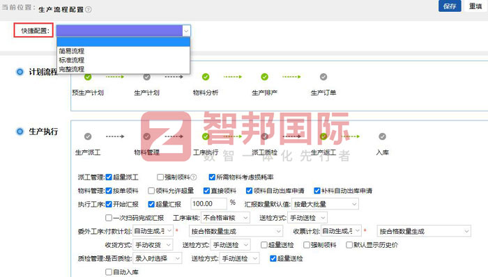 企业可根据自身实际生产管理场景,在智邦国际ERP系统里设置生产流程。系统提供了3种生产流程配置选项,如果要对企业进行粗犷式管理,可以选择简易流程,不管理到工序。如果要对企业进行精细化管理,可以选择标准流程或者完整流程,管理到工序,工序质检和成品质检。