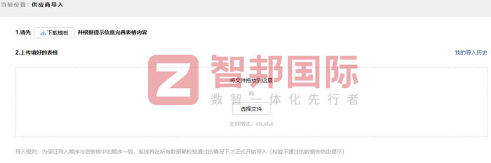 为提高供应商信息录入效率,智邦国际ERP系统支持供应商批量导入,在线下载模板,并根据提示信息完善表格内容,将填好的文件一键拖拽至虚线框内,系统自动校验全部数据,数据校验通过后,系统才开始正式导入,充分保证导入顺序与表格中的顺序一致。系统帮助企业从源头把控采购质量,提升产品品质和品牌知名度。