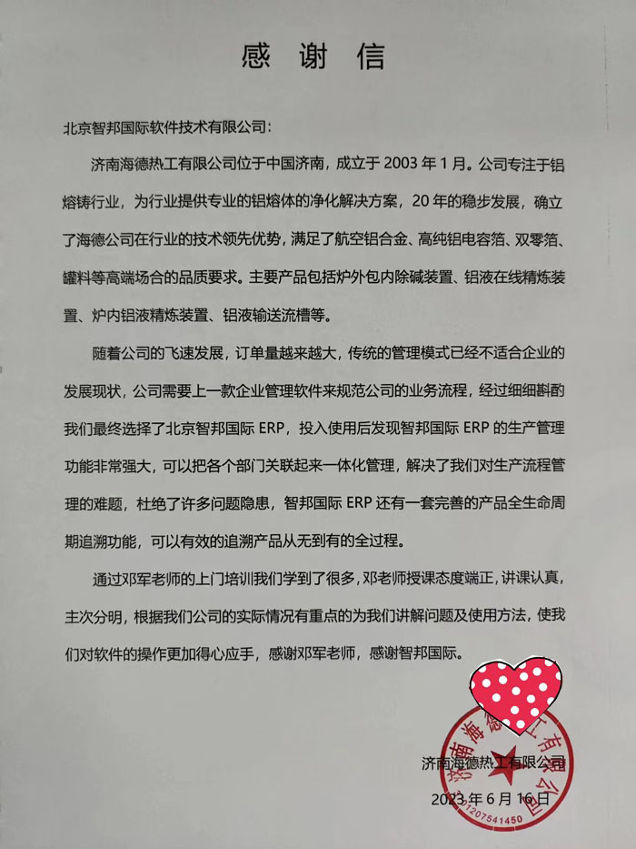 海德热工向智邦国际送感谢信