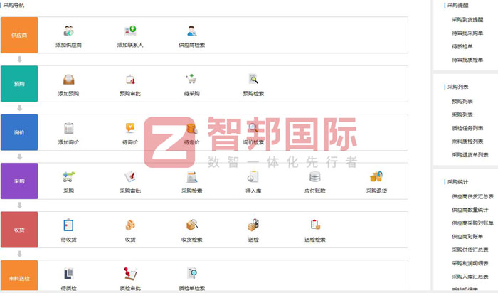 为帮助企业实现智慧采购,智邦国际ERP系统设有一站式采购导航,覆盖供应商管理、预购管理、询价管理、采购管理、收货管理、来料送检管理等功能模块,各功能模块之间的数据互联互通,单据自由流转于各岗位之间,打破各环节信息壁垒,提高协作效率,保障企业资金安全。